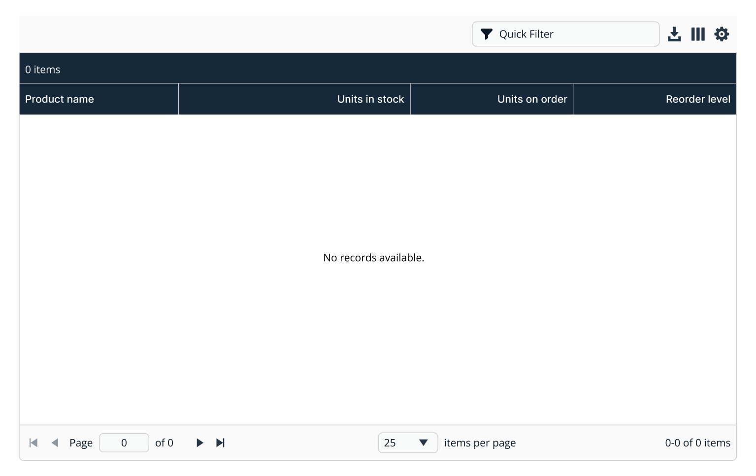 A grid is in an empty state when there is no data to display, an error happens when loading the data, or a filter has no matching rows.