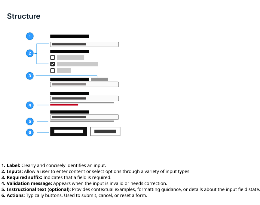 A well designed form features clear groupings, intuitive fields and concise instructional text. Key structural principles include clearly visible labels positioned above the input fields, logical groupings of fields, and should only include fields that are essential for the user to complete their task. It's important to match input types to the expected data format.