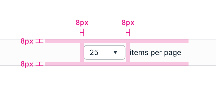 The drop-down label in the middle is "X items per page”. The value of X is the drop-down, followed by “items per page”.