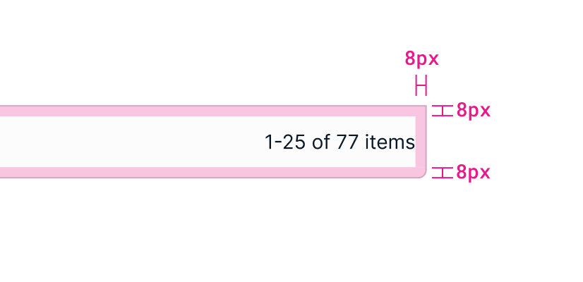 Text reading "X-Y of Z items" appears on the right-most side of pagination. X and Y is the range of data items that are shown on the current page, and Z is the total number of records. As a user pages through the data, the current range automatically changes to show where they are in the dataset. For example, “41-65 of 500 items”.