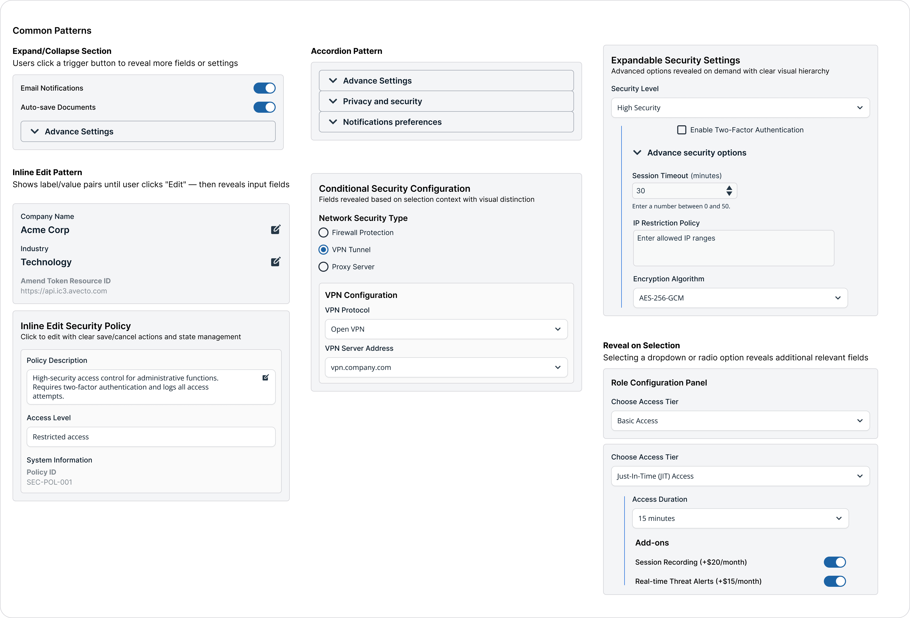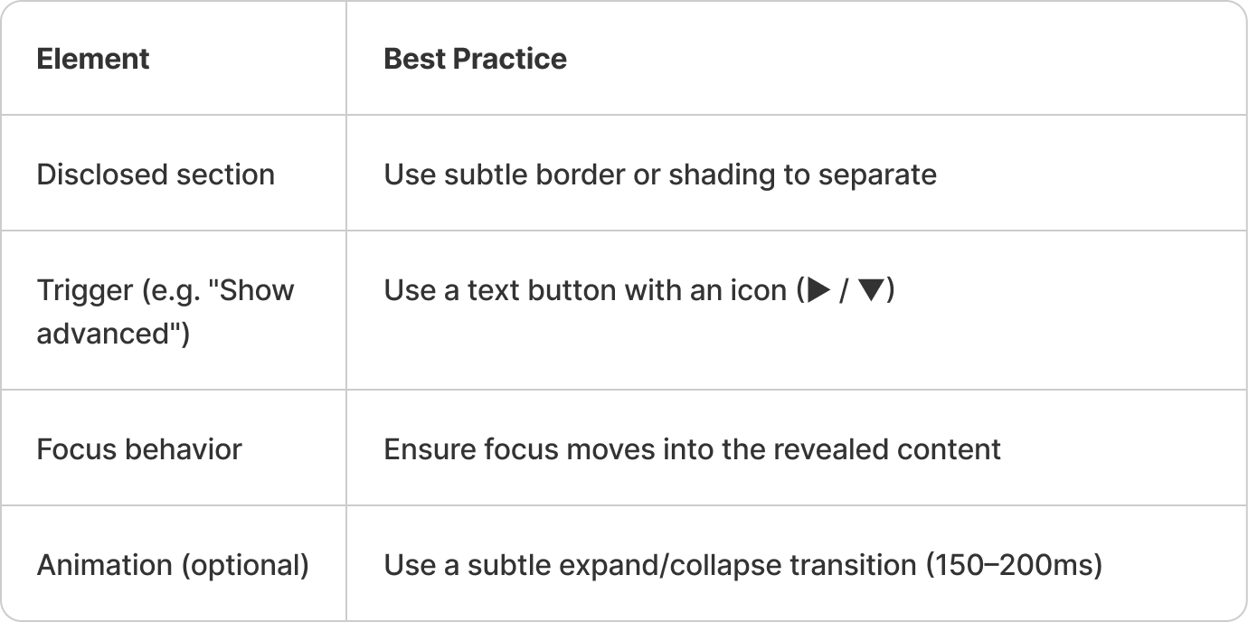 - Label disclosure triggers clearly (e.g., "Show advanced")
