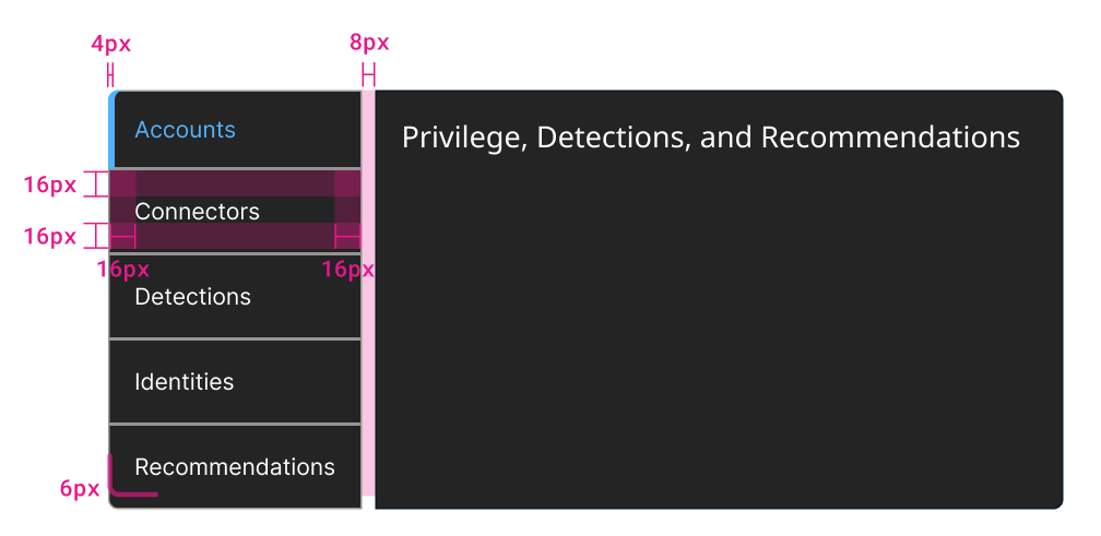 Vertical tabs are stacked vertically to the left of the content. There’s typically a small gap between vertical tabs and the content. Vertical tabs always have a currently selected tab that has an indicator bar to the left.