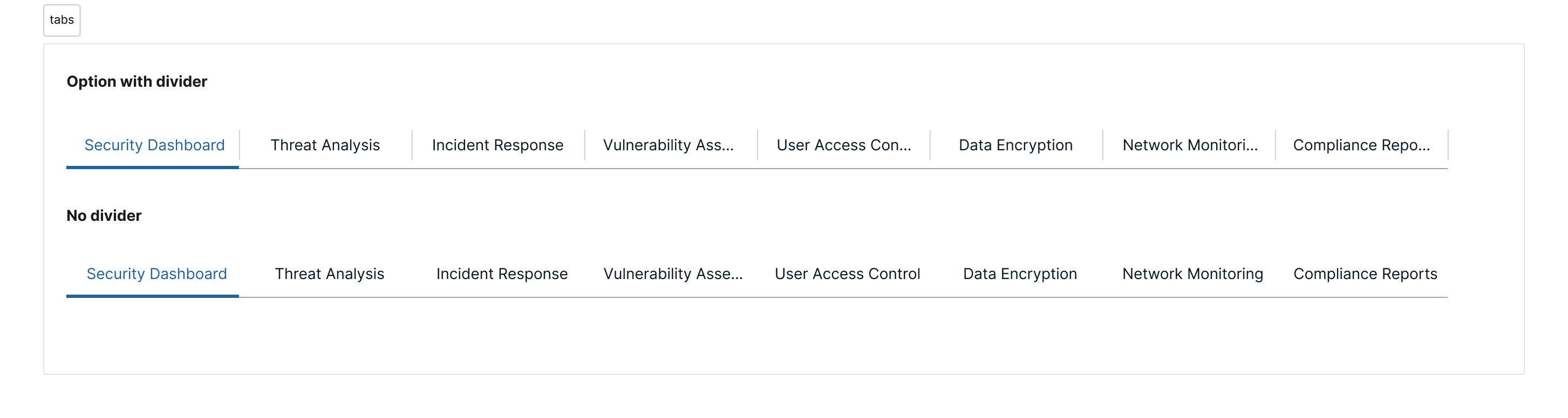 Dividers visually separate tabs from the content area or from each other, helping users orient themselves within a dense interface.