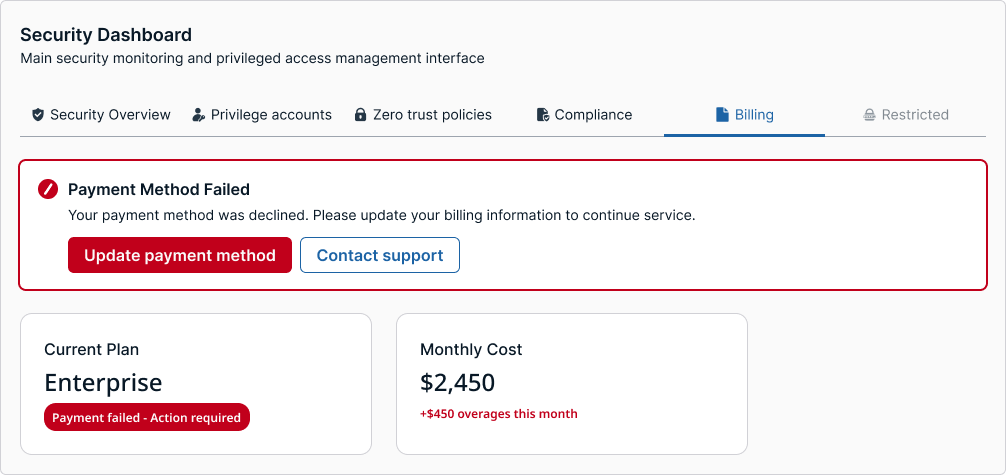 By default, tabs stay neutral—no error icons, no red underlines. Errors live inside the panel as inline field errors or a page-level banner. After a failed Save/Continue, keyboard focus should land on the first errored field; if other tabs contain issues, the banner copy should call them out by name and link to those sections. This keeps navigation calm, avoids red-as-navigation, and prevents ambiguity when more than one section has problems.