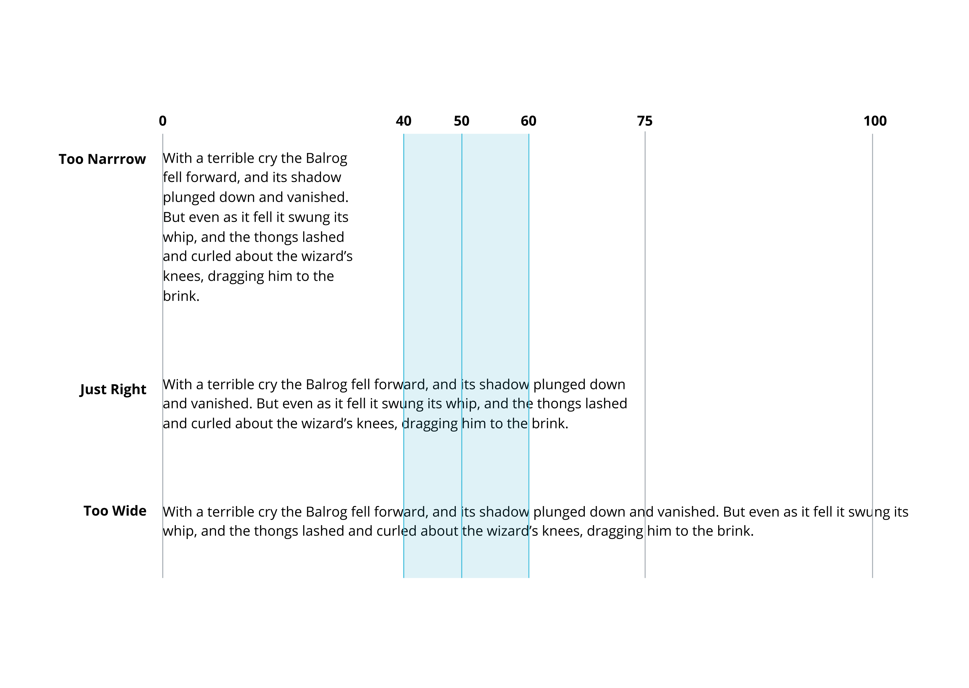 Line length is the number of characters on each line of text. Line length should be between 40 and 60 characters for body copy, and 20 and 50 for headings.