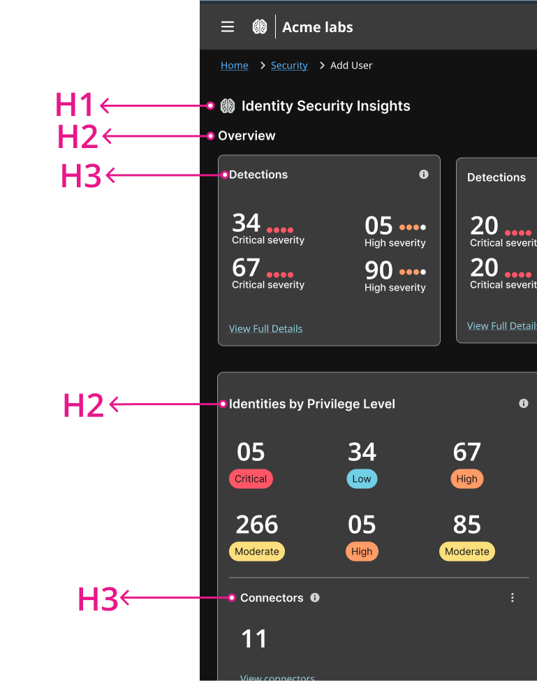 Headings establish a clear hierarchy within our interface. They guide users through the content structure, making it easier to scan and understand. The different levels of headings create a hierarchy of information. Smaller headings are subordinate to larger ones.